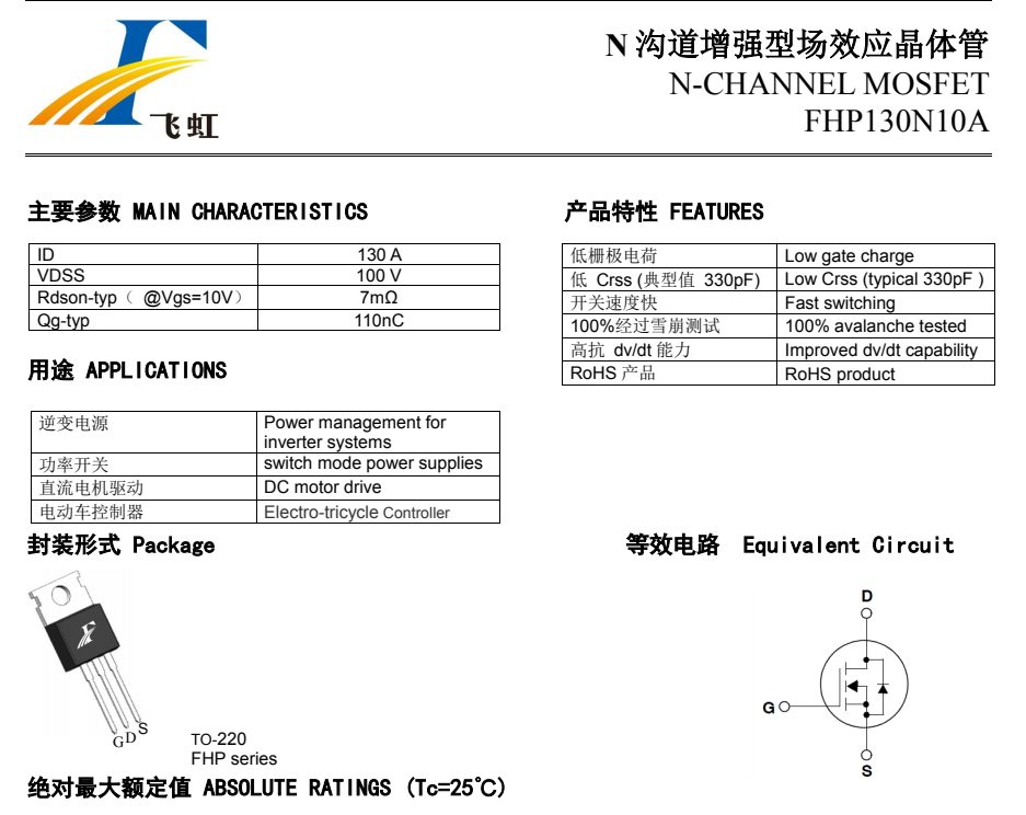 FHP130N10A的主要封裝形式是TO-220。這款產(chǎn)品參數(shù):Vgs(±V):25;ID(A):130A;BVdss(V):100V。