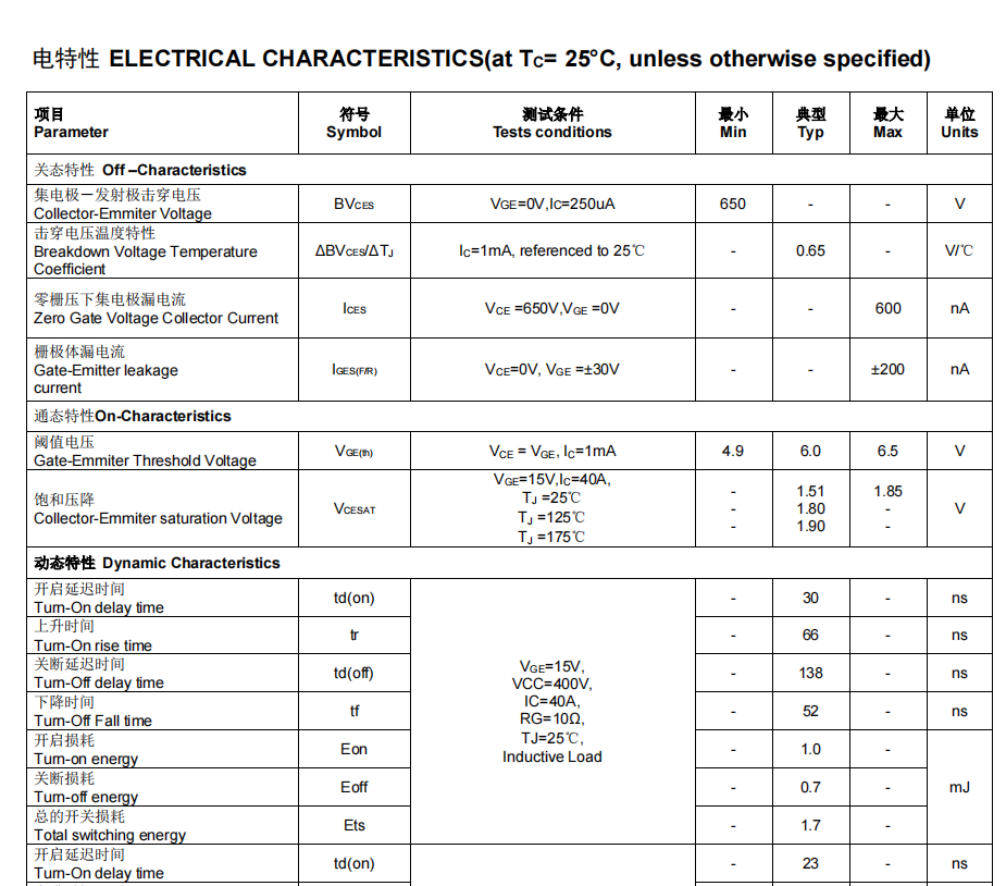 為何?因為FHA40T65A不僅擁有反向并行的快恢復二極管,而且具備高可靠性,Trench Field Stop Ⅱ technology(拖尾電流非常短,出色的Vcesat飽和壓降,UPS高頻逆變電路IGBT代換,FGH40N60SFD型號參數關斷損耗低),擁有正溫度系數。